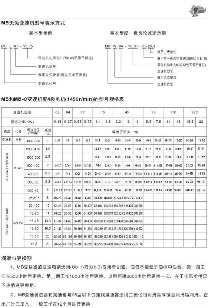 MB無級(jí)變速機(jī)型號(hào)表示法MB和MB-C變速機(jī)配4極電機(jī)(1450r/min)的型號(hào)規(guī)格表潤滑和更換期