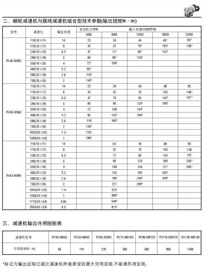 蝸輪減速機(jī)與WB系列擺線減速機(jī)組合型技術(shù)參數(shù)表(輸出扭矩N.M)一減速機(jī)輸出許用扭矩表