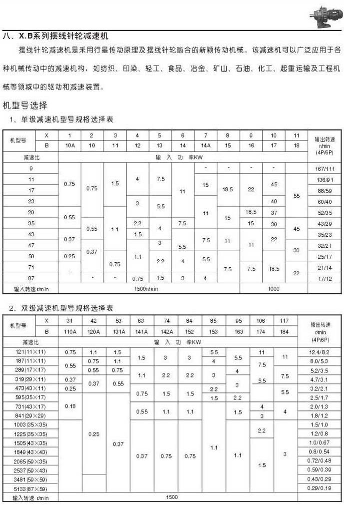 X . B擺線針輪減速機(jī)說明單級(jí)減速機(jī)型號(hào)規(guī)格選擇表雙級(jí)減速機(jī)型號(hào)規(guī)格選擇表